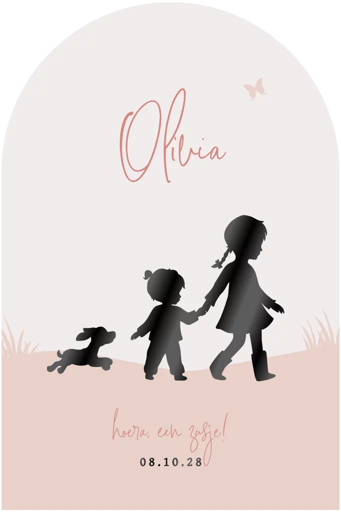 Op zoek naar een geboortekaartje voor een tweede kindje? Ga voor dit trendy ontwerp met hoogglans zwarte silhouetjes! Dit geboortekaartje heeft een bijzondere vorm én wordt bedrukt met hoogglans. Grote en kleine zus wandelen hand in hand en een hondje rent vrolijk achter ze aan. Liever andere kleuren of lettertypes? Pas dit kaartje naar eigen wens aan in onze editor.