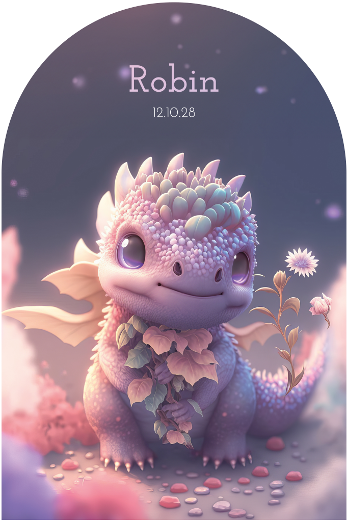Creëer een magisch geboortekaartje met een adembenemende draakje in een betoverende sprookjesstijl. De naam van jullie dochter is gedrukt in schitterende regenboogfolie. Verwelkom jullie kleintje met dit unieke geboortekaartje in een prachtige boogvorm. Pas eenvoudig het ontwerp aan in onze gebruiksvriendelijke editor en bestel een proefdruk om het resultaat te bewonderen.