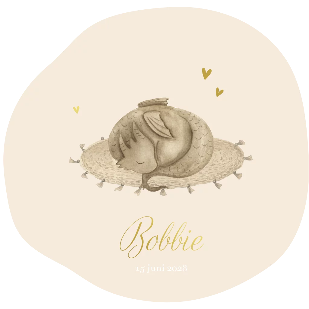 Laat de komst van jullie kindje weten met een uniek beige geboortekaartje. Op een charmant rieten matje ligt een schattig bruin draakje te slapen. De naam en hartjes zijn met goudfolie gedrukt. Pas het ontwerp naar eigen smaak aan in onze editor en bestel eenvoudig een proefdruk om het zelf te beleven.