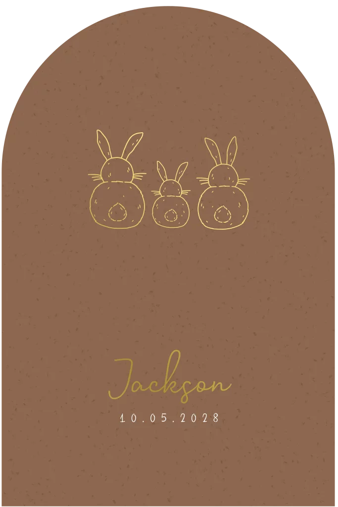 Een donkerbruin geboortekaartje met drie lieve konijntjes in goudfolie. De achtergrond van dit kaartje heeft een papiertextuurtje en de vorm is met de afgeronde bovenkant heel bijzonder! Liever een andere kleur folie of achtergrond? Pas dit ontwerp eenvoudig aan in onze ontwerptool.