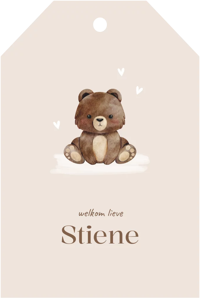 Lief geboortekaartje in unieke labelvorm met een schattig beertje en beige achtergrond. De kleine hartjes maken dit kaartje tot een schattig geheel. Zowel leuk voor een jongetje als meisje en dus ook als je nog niet weet of je een zoontje of dochtertje krijgt! Je kunt dit kaartje eventueel afmaken met een lintje of touwtje. Pas de lettertypes of kleuren aan in onze editor en bestel een proefdruk om dit leuke geboortekaartje in het echt te kunnen bewonderen.
