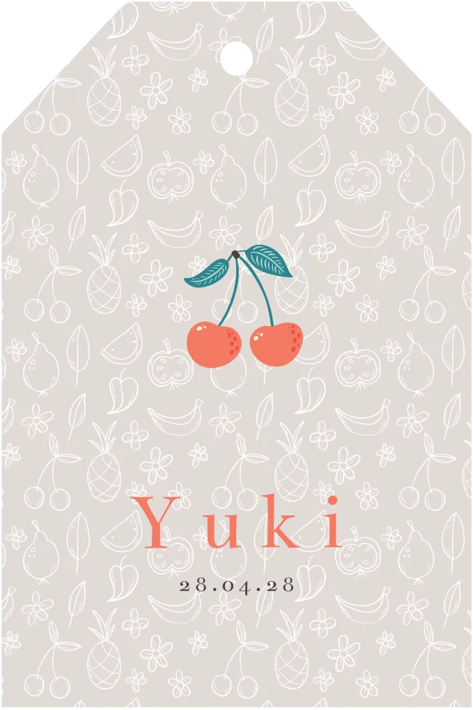 Schattig geboortekaartje in neutrale kleur met op de achtergrond allemaal kleine fruit doodles. Daarop staan de kersen die mooi afsteken tegen de achtergrond. De kaart heeft de vorm van een label, maak het helemaal af door er een mooi lint aan te knopen. Personaliseer dit lieflijke ontwerp eenvoudig zelf in onze editor.