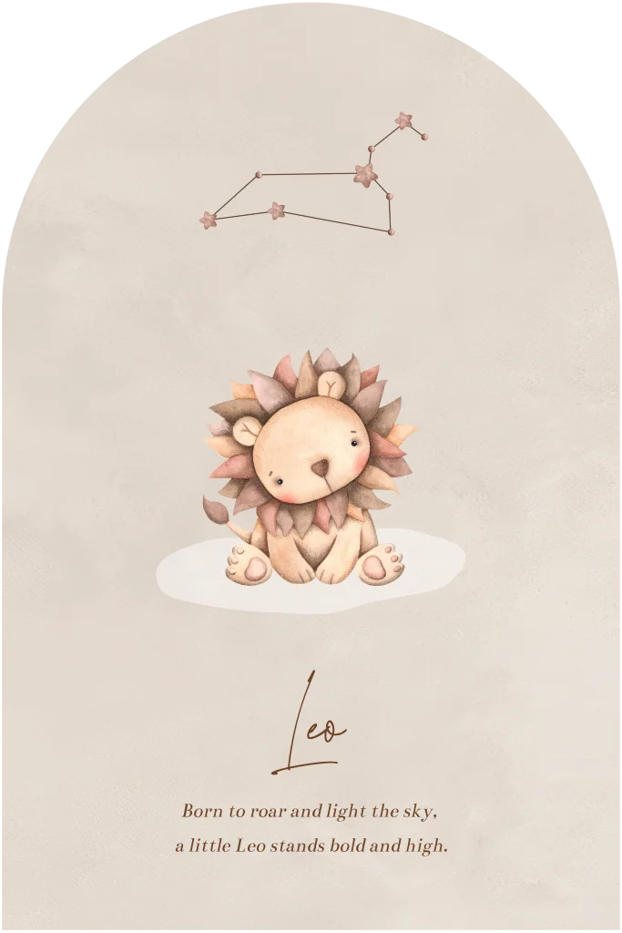 Lief geboortekaartje met sterrenbeeld Leeuw, met een schattig zittend leeuwtje en een subtiele sterrenbeeld-illustratie. Perfect voor een krachtig, vrolijk en warm kindje. Dit kaartje straalt moed, trots en levenslust uit — ideaal voor ouders die hun baby op een bijzondere manier willen verwelkomen. Geschikt voor baby’s geboren tussen 23 juli en 22 augustus.