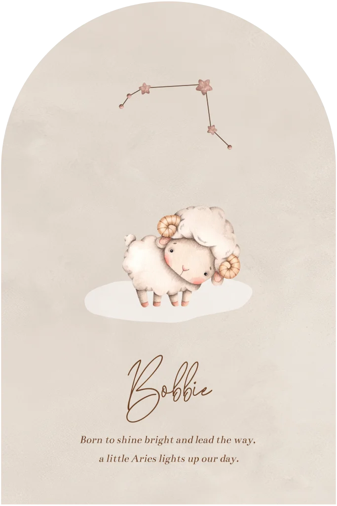 Uniek geboortekaartje met het sterrenbeeld Ram, perfect voor een stoer en avontuurlijk kindje. Dit kaartje toont een schattig rammetje en een stijlvolle sterrenbeeld-illustratie. Ideaal voor ouders die iets bijzonders zoeken en hun kleintje willen verwelkomen met een persoonlijke touch. Geschikt voor baby’s geboren tussen 21 maart en 19 april.
