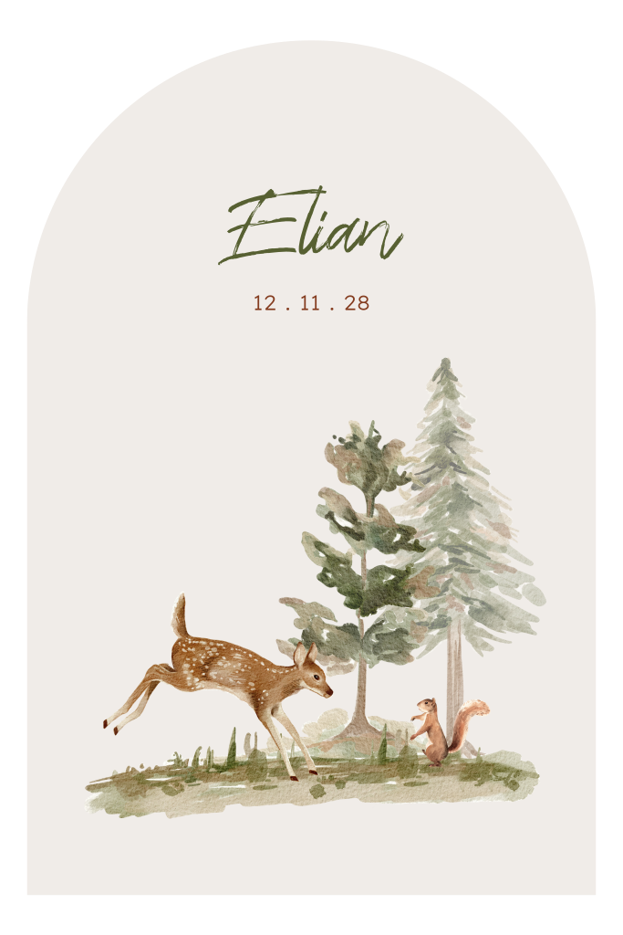 Prachtig herfst geboortekaartje met een mooi waterverf tafereel van een lief hertje in het bos. Een eekhoorn kijkt toe hoe het hertje aankomt rennen. Pas de kaart naar wens aan in de ontwerptool. De mooie halfronde vorm maakt het kaartje extra bijzonder. Wil je dit niet? Neem dan contact met ons op.