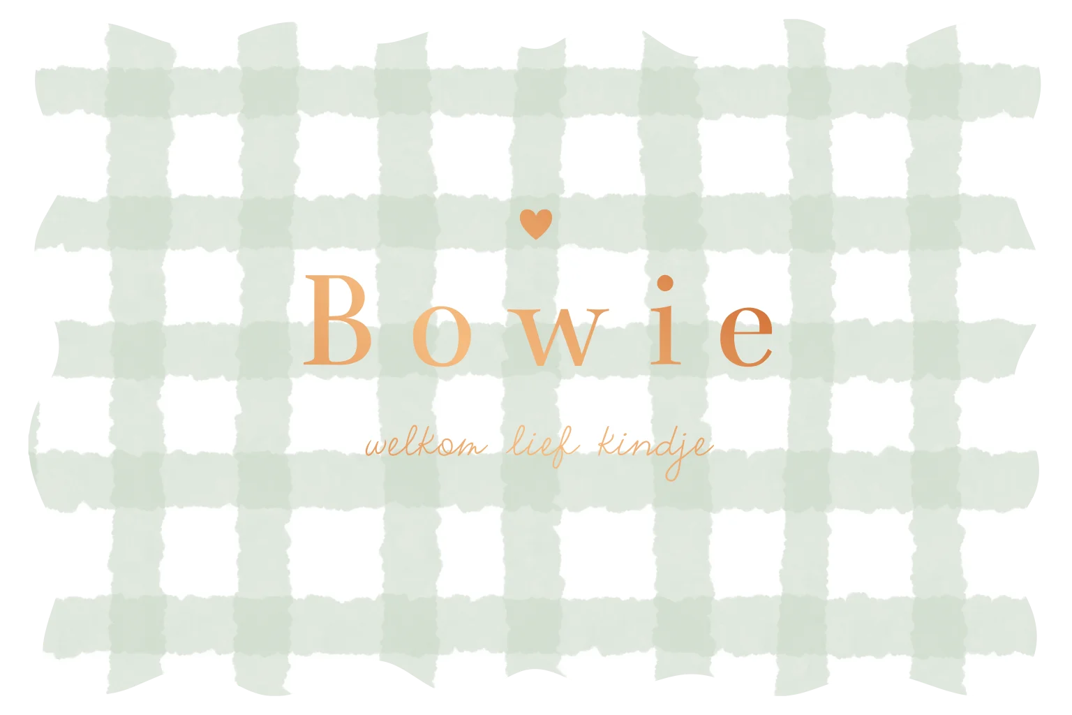 Uniek geboortekaartje in zachtgroen met wit en koperfolie. Dit leuke kaartje wordt gesneden in een vrolijke vorm met wiebelige randjes. De groene ruitjes kun je zelf eenvoudig veranderen van kleur, zo ook de tekst! Zo maak je er een echt persoonlijk geboortekaartje voor je pasgeboren kindje van. Benieuwd naar dit kaartje? Bestel een proefdruk!