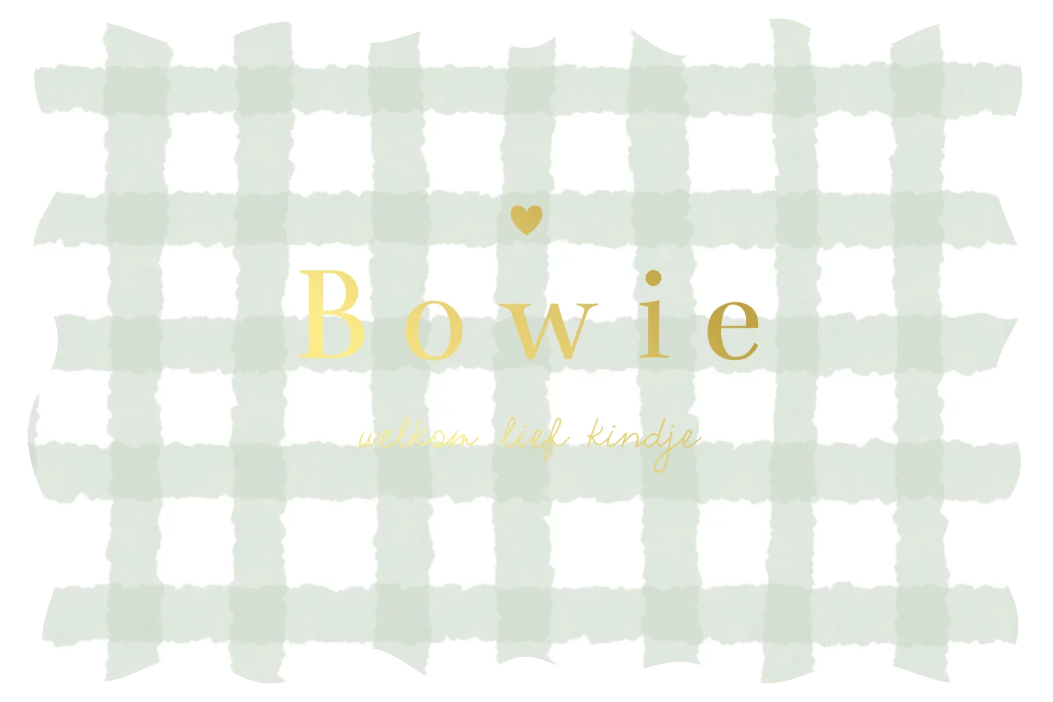 Uniek geboortekaartje in zachtgroen met wit en goudfolie. Dit leuke kaartje wordt gesneden in een vrolijke vorm met wiebelige randjes. De groene ruitjes kun je zelf eenvoudig veranderen van kleur, zo ook de tekst! Zo maak je er een echt persoonlijk geboortekaartje voor je pasgeboren kindje van. Benieuwd naar dit kaartje? Bestel een proefdruk!