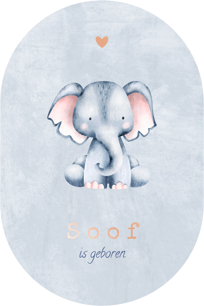 Schattig geboortekaartje met grijsblauwe achtergrond en lief olifantje. De naam van je kindje komt in roségouden foliedruk voorop. Op de achterzijde van dit ovale kaartje komt de info over je pasgeboren kindje. Pas dit geboortekaartje zelf aan in onze handige editor en bestel een proefdruk.