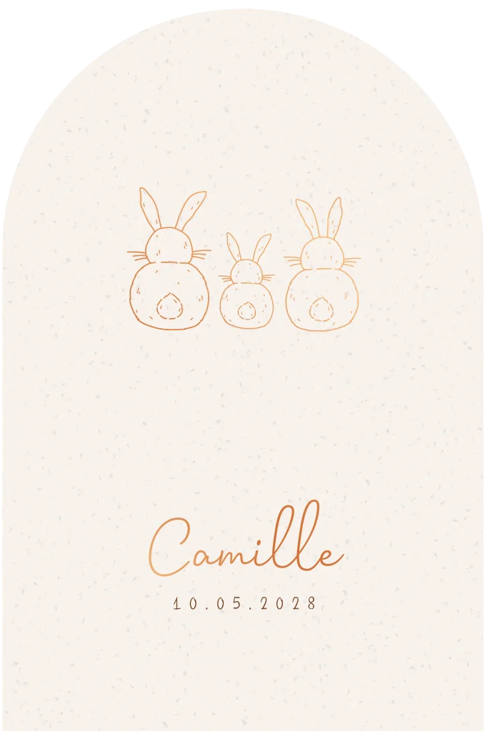 Een beige geboortekaartje met drie lieve konijntjes in koperfolie. De achtergrond van dit kaartje heeft een beige papiertextuurtje en de vorm is met de afgeronde bovenkant heel bijzonder! Liever een andere kleur folie of achtergrond? Pas dit ontwerp eenvoudig aan in onze ontwerptool.