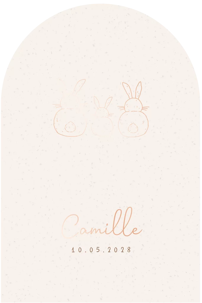 Een beige geboortekaartje met drie lieve konijntjes in roségoudfolie. De achtergrond van dit kaartje heeft een beige papiertextuurtje en de vorm is met de afgeronde bovenkant heel bijzonder! Liever een andere kleur folie of achtergrond? Pas dit ontwerp eenvoudig aan in onze ontwerptool.