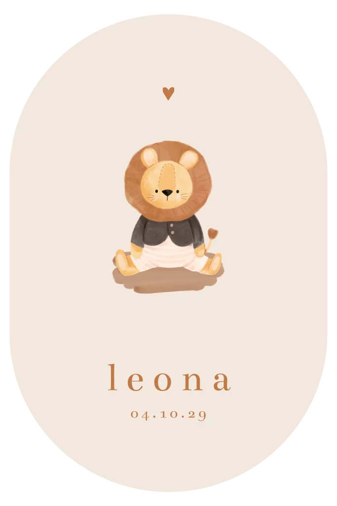 Beige geboortekaartje in ovale vorm van schattig leeuwtje. Of er nu een meisje of jongen op komst is, met dit lieve ontwerp kondig je zijn of haar geboorte aan in stijl. Liever een ander lettertype of de achtergrondkleur? Pas dit kaartje aan met onze handige ontwerptool.