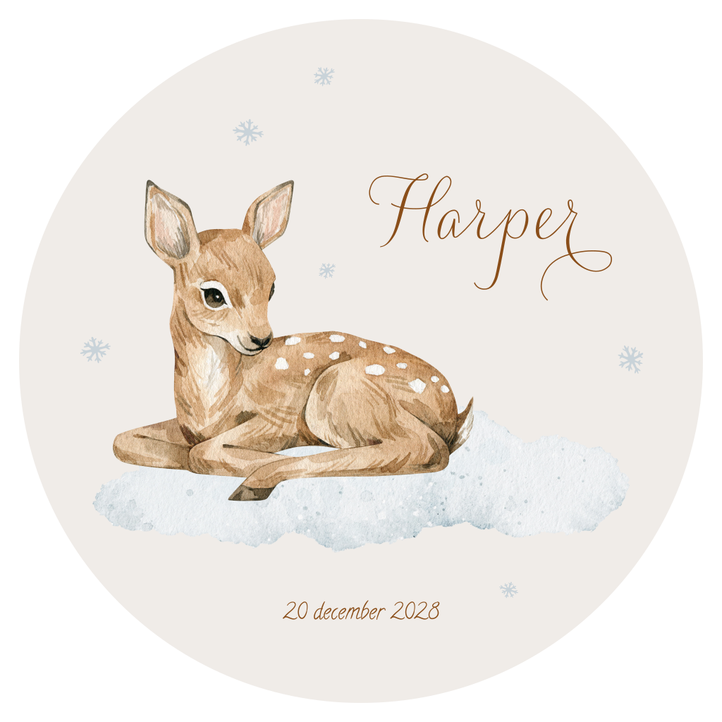 Origineel geboortekaartje voor een winterkindje! Op ronde kaartje staat een schattig hertje met daaromheen sneeuwvlokjes. Op de achterkant is ruimte voor alle geboortegegevens van je kindje. Bestel een proefdruk om deze kaart in het echt te kunnen zien.