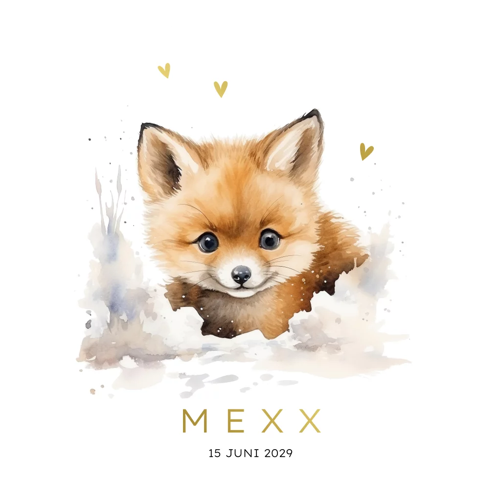 Lief geboortekaartje met een schattig vosje in een winters sneeuwlandschap. De naam en hartjes zijn prachtig afgewerkt in goudfolie, wat het ontwerp een luxe uitstraling geeft. De ronde vorm met een gaatje biedt ruimte voor een mooi lint, waarmee je het kaartje extra bijzonder kunt maken. Pas het ontwerp eenvoudig aan in onze gebruiksvriendelijke editor en bestel een proefdruk om het eindresultaat te bewonderen.