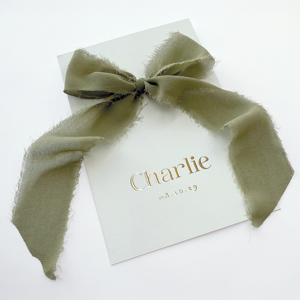 Prachtig geboortekaartje met ruimte voor een grote strik van chiffon lint. De naam wordt gedrukt in mooi goudfolie. Een eenvoudig ontwerp, maar toch heel uniek door het prachtige lint en de foliedruk naam. Dit witte geboortekaartje voor zowel een jongen als meisje is gemakkelijk te personaliseren in onze editor.