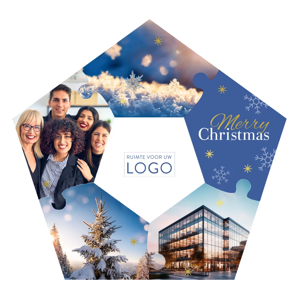 Deze vijfhoekige kerstkaart bestaat uit vijf puzzelstukjes, waarvan twee eigen bedrijfsfoto’s bevatten en in het midden ruimte is voor een bedrijfslogo. De kaart heeft een feestelijk ontwerp met sneeuwvlokken en een "Merry Christmas"-wens, en kan volledig worden gepersonaliseerd voor een zakelijke kerstgroet.