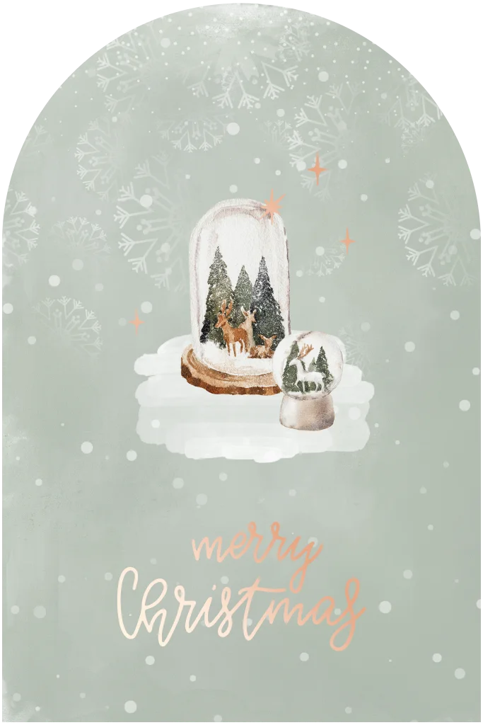 Sfeervolle kerstkaart in unieke boogvorm en met glimmend roségoudfolie. Wens je vrienden en familie een fijne kerst toe met deze zachtgroene kaart met sneeuw, roségoudfolie typografie en een waterverf illustratie van sneeuwbollen. Op de achterzijde kun je een persoonlijke kerstgroet plaatsen.