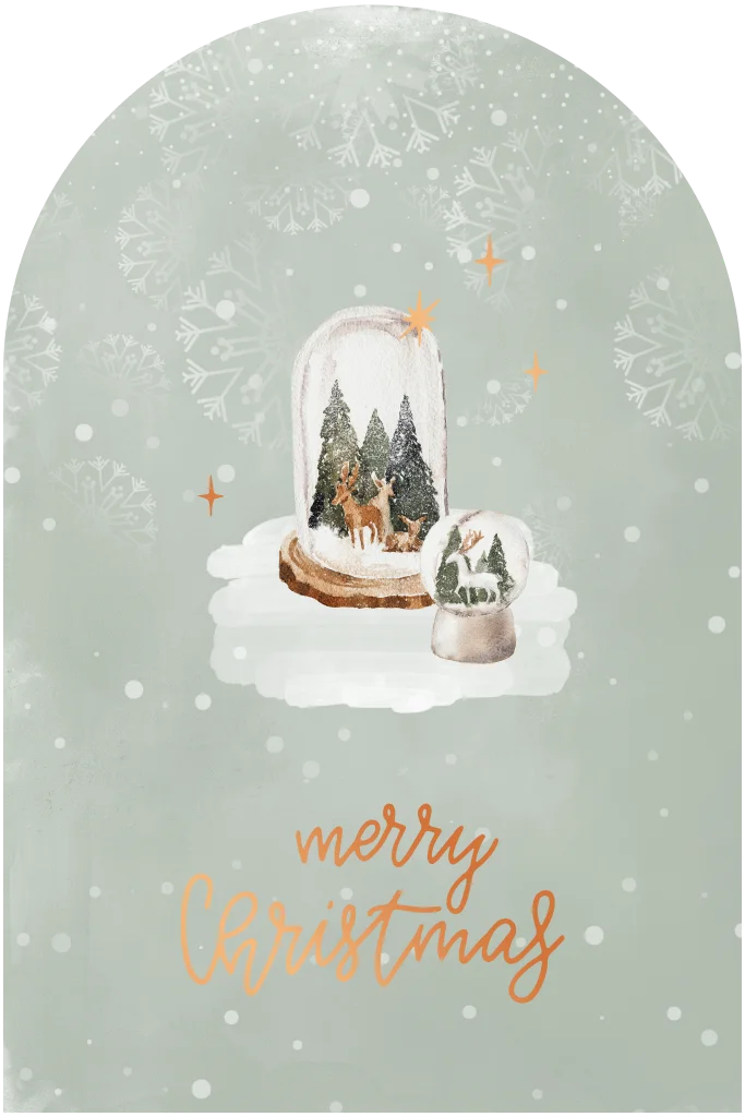 Sfeervolle kerstkaart in unieke boogvorm en met glimmend koperfolie. Wens je vrienden en familie een fijne kerst toe met deze zachtgroene kaart met sneeuw, koperfolie typografie en een waterverf illustratie van sneeuwbollen. Op de achterzijde kun je een persoonlijke kerstgroet plaatsen.