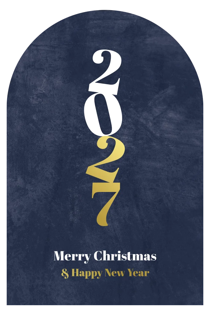 Op zoek naar een opvallende en moderne kerstkaart voor een zakelijke kerstgroet? Ga voor dit donkerblauwe ontwerp met goudfolie 2027. De kaart heeft een unieke boogvorm en wordt versierd door goudfolie typografie. Op de voorzijde staat het jaartal op een speelse manier opgestapeld. Op de achterkant kunt u zelf een persoonlijke groet plaatsen, plus het logo van uw bedrijf. Dit tijdloze ontwerp is zelf eenvoudig te personaliseren met behulp van onze handige editor.