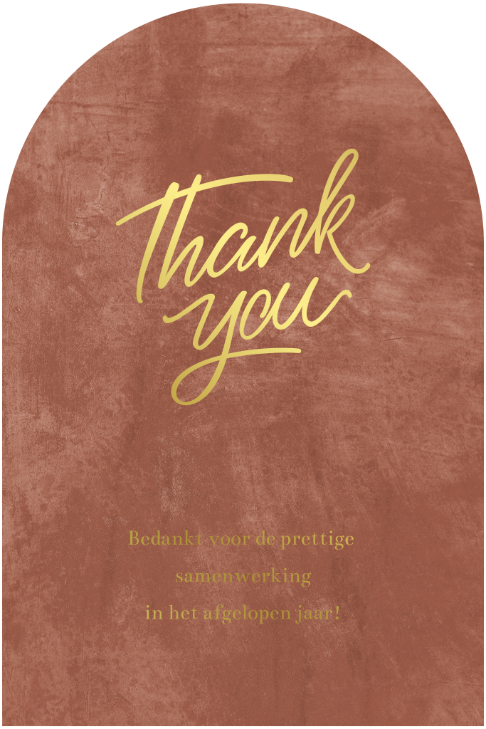 Een minimalistische kerstkaart met goudfolie typografie op een roestbruine achtergrond. Bedank uw zakelijke contacten voor een succesvolle samenwerking en wens ze een prettig nieuwjaar! Op de achterzijde van deze kaart in unieke vorm is ruimte voor een eigen foto. Pas deze kaart zelf aan in onze editor.
