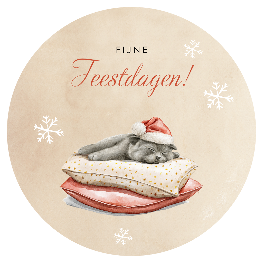 Op de voorkant van deze ronde kerstkaart zie je een snoezige kat met een schattige kerstmuts op, die vredig slaapt op een stapel zachte, pluizige kussens. Heb je een kattenpension of ben je een kattenliefhebber dan is deze kerstkaart perfect voor jouw. Pas de kaart eenvoudig aan met de designtool.