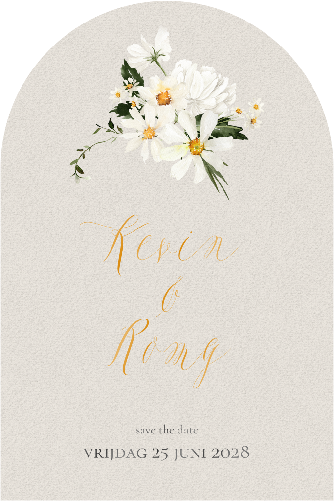 Fleurige save the date kaart in de vorm van een boog met mooie bos margrietjes op een beige papieren ondergrond. Jullie namen staan eronder in een mooi klassiek lettertype gedrukt in hoogglans, net als de trouwdatum en save the date.