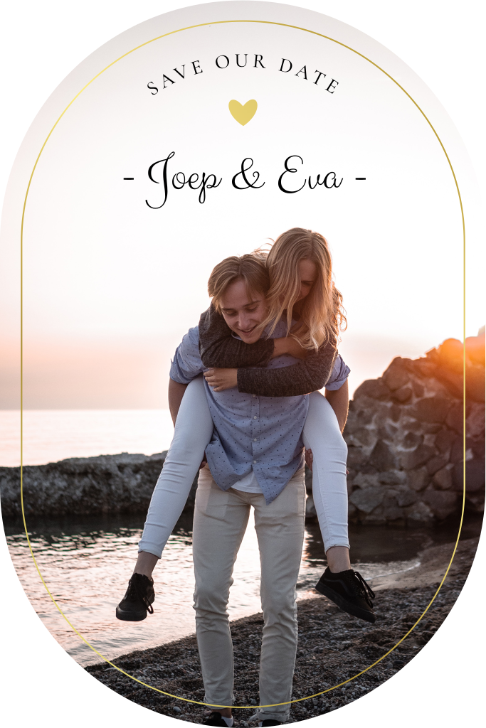 Heb je een fotoshoot laten maken en zoek je een originele save the date kaart waar je de mooiste foto op kwijt kan? Op dit ontwerp heb je alle ruimte voor een mooie foto en het heeft ook nog een bijzonder formaat! Met het goudfolie randje maak je de kaart helemaal af.