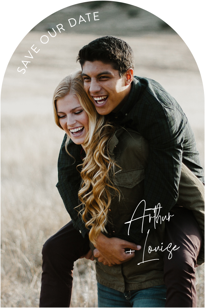 Mooie save the date kaart in de vorm van een boog met voorop een beeldvullende foto. In ronde tekst staat er 'Save Our Date' en achterop in ronde tekst 'Wij zeggen Ja!'. Heb je een mooie foto van jullie samen? Kies dan voor deze mooie kaart met bijzondere vorm.