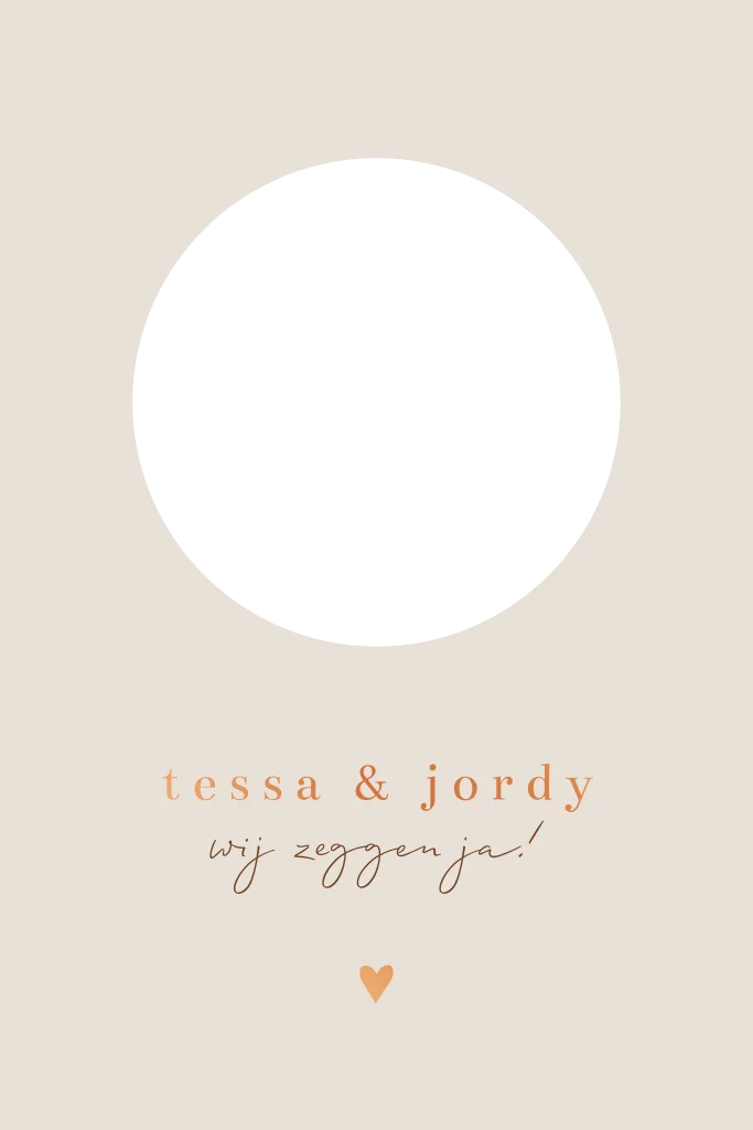 Elegantie ontmoet eenvoud in deze beige trouwkaart met ronde uitsnede. Het subtiele doorkijkje onthult een mooie foto van jullie samen (of van jullie trouwlocatie?). Koperfolie voegt een vleugje feestelijkheid en luxe toe. Een prachtige trouwuitnodiging met een persoonlijk tintje. Pas deze kaart zelf naar eigen wens aan in onze ontwerptool.