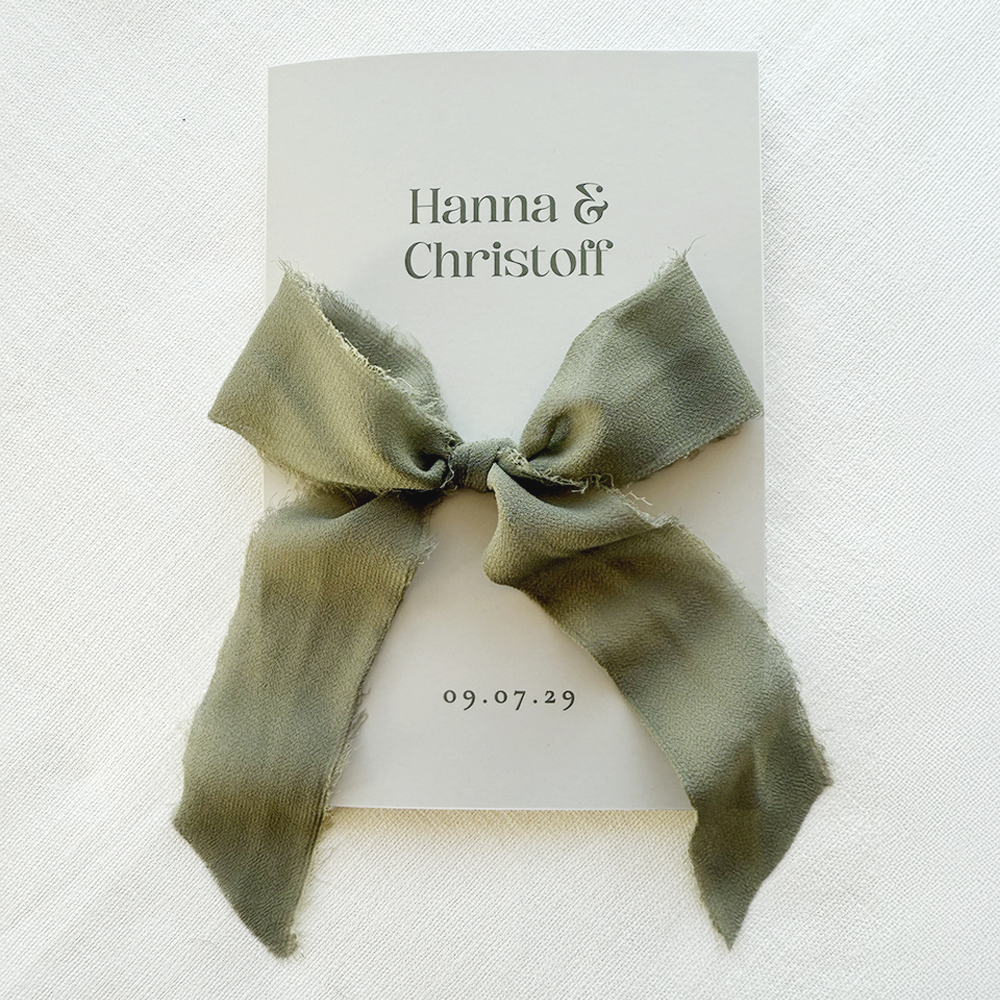 Ontdek deze beige, eenvoudige trouwkaart, met ruimte voor een mooie strik van chiffon lint. Jullie namen spatten in glimmend hoogglans in grijsgroen van de voorkant af. De kaart is simpel opgemaakt, maar door de hoogglans en de toevoeging van het lint, wordt het toch een luxe en stijlvolle uitnodiging. Pas eenvoudig aan met de editor en maak deze trouwuitnodiging passend bij jullie grote dag.