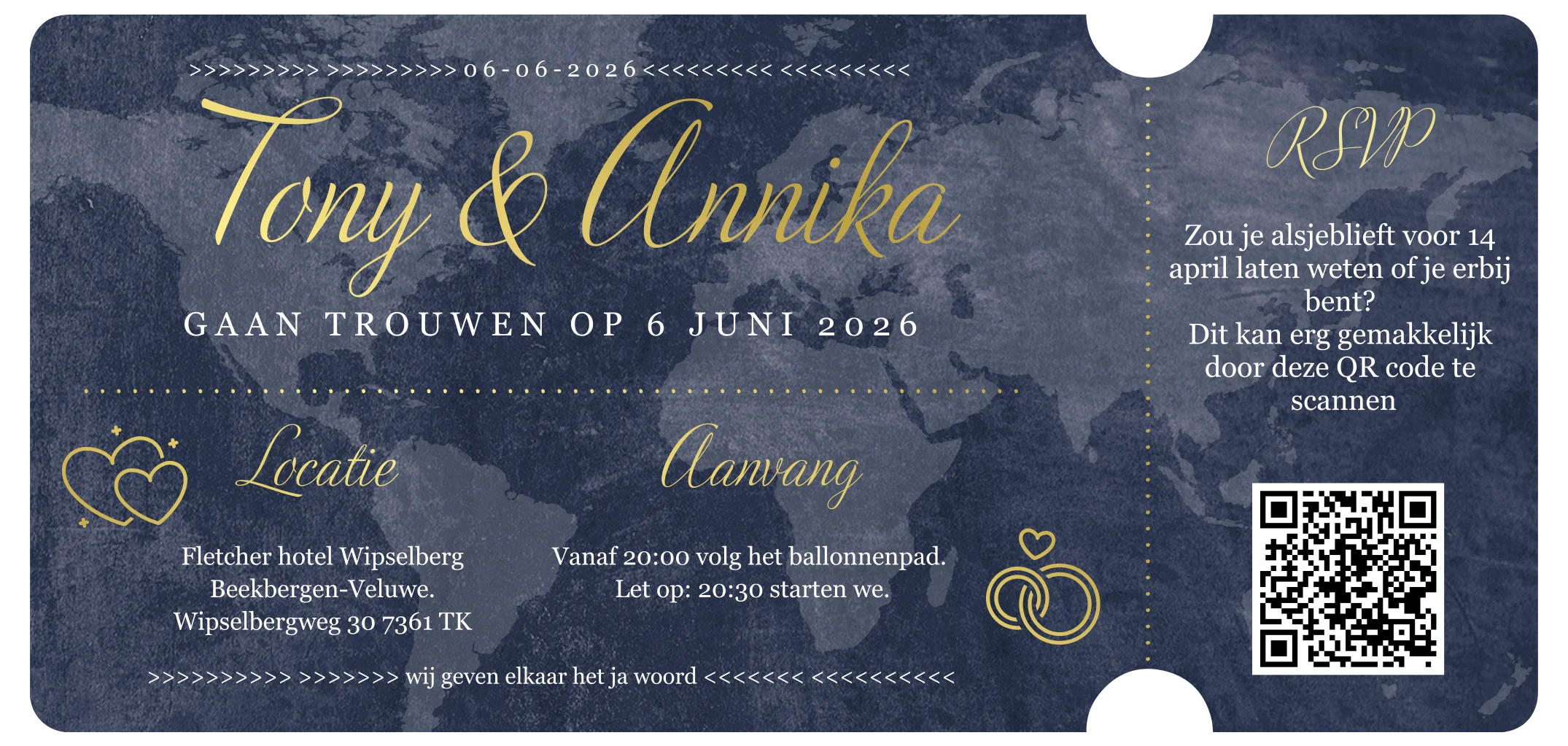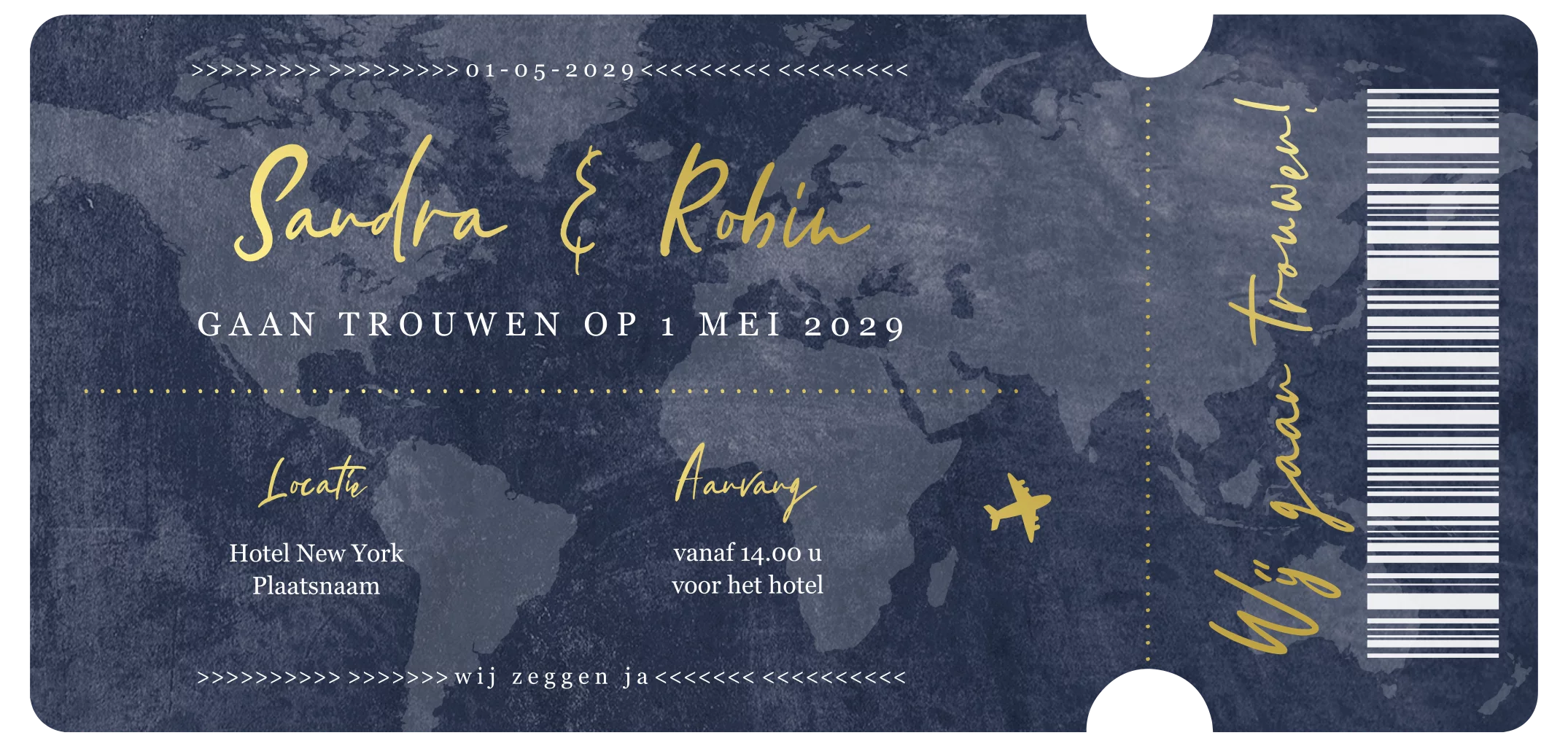 Zijn jullie dol op reizen of trouwen jullie in het buitenland? Nodig jullie gasten uit met dit donkerblauwe ontwerp met goudfolie in de vorm van een vliegticket. Op de achtergrond staat een wereldkaart en de kaart wordt verder versierd met een gouden vliegtuigje. De stansvorm zorgt voor de unieke ticketvorm, dat maakt deze trouwkaart helemaal af! Pas dit ontwerp zelf aan in onze editor.