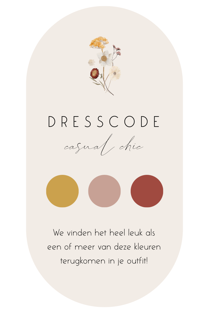 Leuk inlegkaartje in bijzondere vorm met wilde bloemen en beige achtergrond. Voeg dit kleine kaartje toe aan jullie trouwuitnodigingen om bijvoorbeeld aan te geven wat de dresscode is van jullie dag. Pas dit ontwerp zelf aan in onze handige editor. Dit inlegkaartje sluit mooi aan bij onze trouwkaart 'Beige trouwkaart met wilde bloemenkrans'.