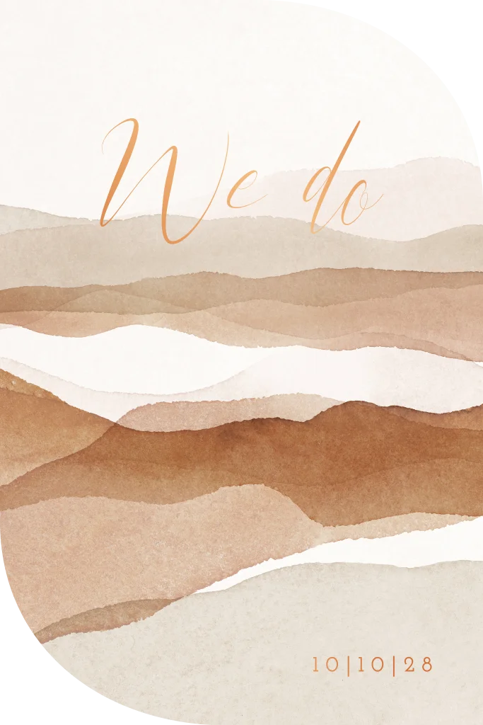 Een bijzondere trouwuitnodiging in unieke vorm. In koperfolie letters komt 'We do' op een abstract landschap in warme tinten. Op de achterzijde van deze enkele trouwkaart kun je de informatie over jullie bruiloft kwijt. Pas dit ontwerp zelf aan naar eigen wens in onze editor.