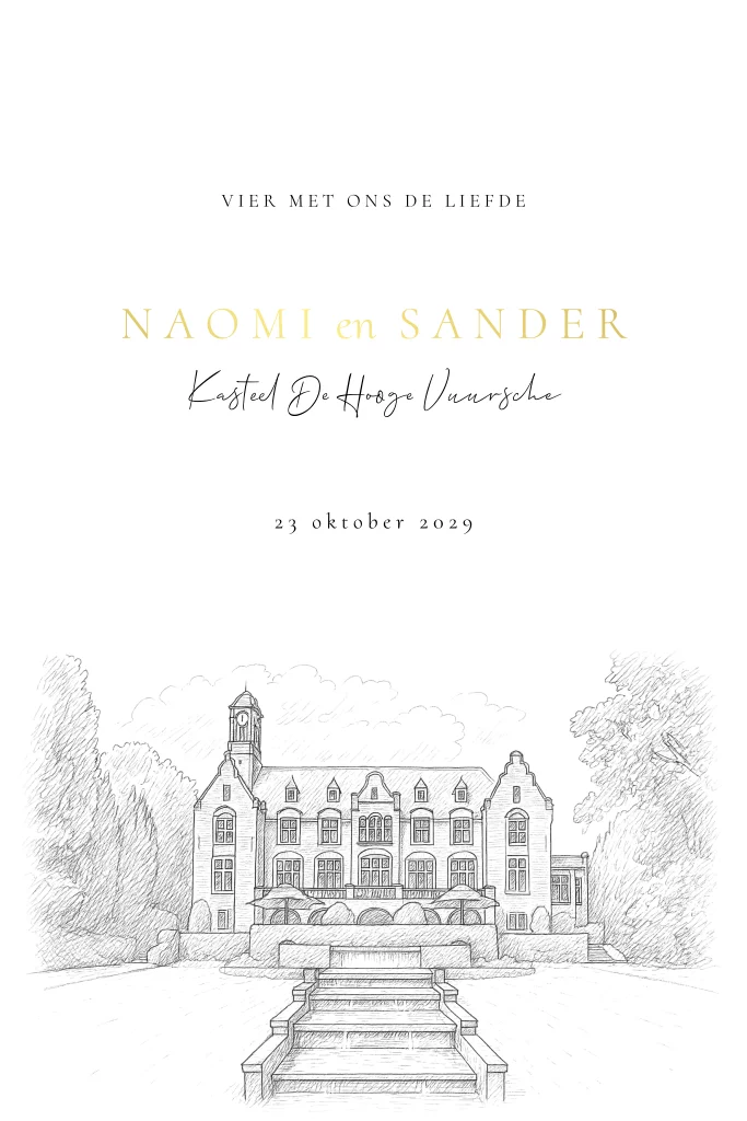 Deze romantische trouwkaart toont een verfijnde potloodillustratie van Kasteel De Hooge Vuursche op de voorzijde – een persoonlijke weergave van jullie trouwlocatie. De namen van het bruidspaar en de locatie worden geaccentueerd met goudfolie, wat de kaart een extra feestelijke uitstraling geeft, net als de halfronde vorm. Je kunt de kaart eenvoudig zelf bewerken in onze online editor en vooraf een proefdruk aanvragen om het eindresultaat in het echt te bekijken.