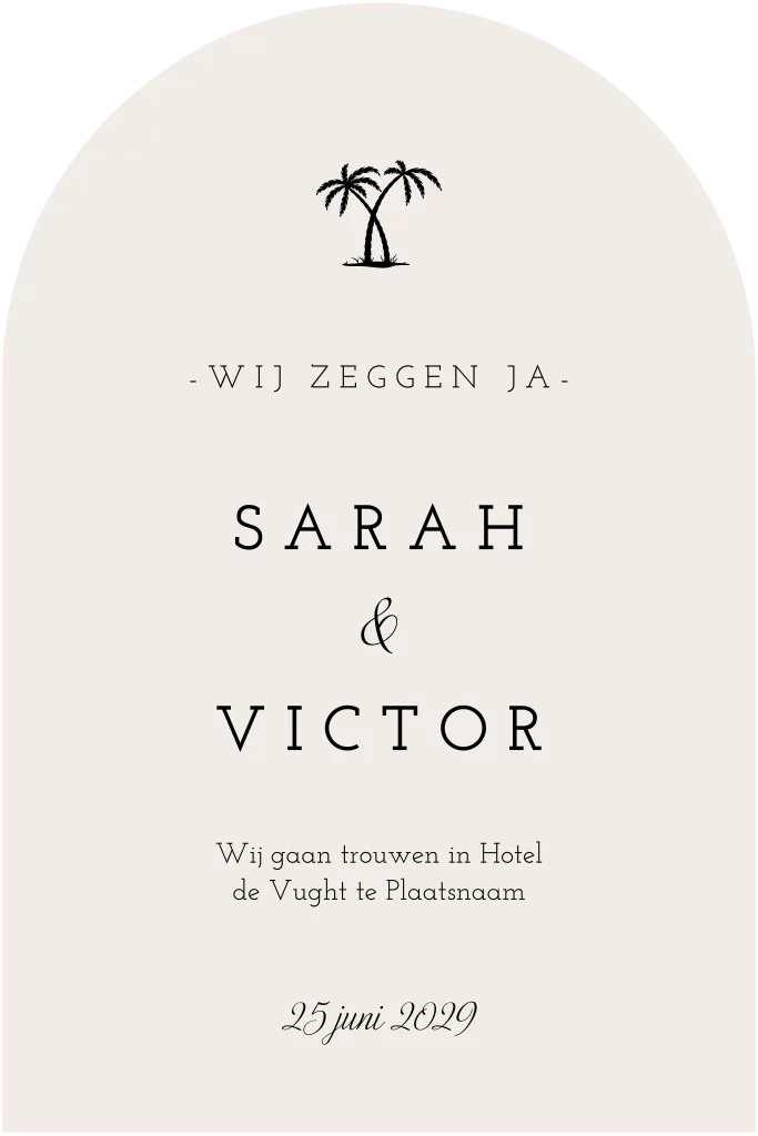 Deze trouwkaart heeft een unieke boogvorm en een minimalistisch design, perfect voor een moderne bruiloft. De kaart is uitgevoerd in een zachte crème kleur en voorzien van een illustratie van twee palmboompjes in zwart, wat zorgt voor een tropische uitstraling. De combinatie met een strak lettertype geeft de kaart een tijdloze en stijlvolle look.