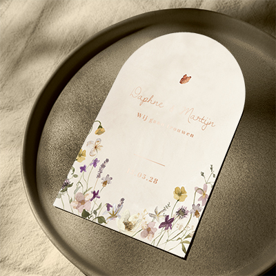 Luxe trouwkaart in boogvorm met onderin een strook met wildflowers. Jullie namen zijn in roségoudfolie gedrukt, dit geeft een mooie luxe uitstraling net als de bijzondere boogvorm. Op de achterkant van deze trouwkaart is ruimte voor verdere informatie over jullie trouwdag. Pas dit ontwerp zelf aan in onze handige editor. Ben je op zoek naar een trouwkaart met veldbloemen? Bekijk dan eens onze collectie trouwkaarten met bloemen.