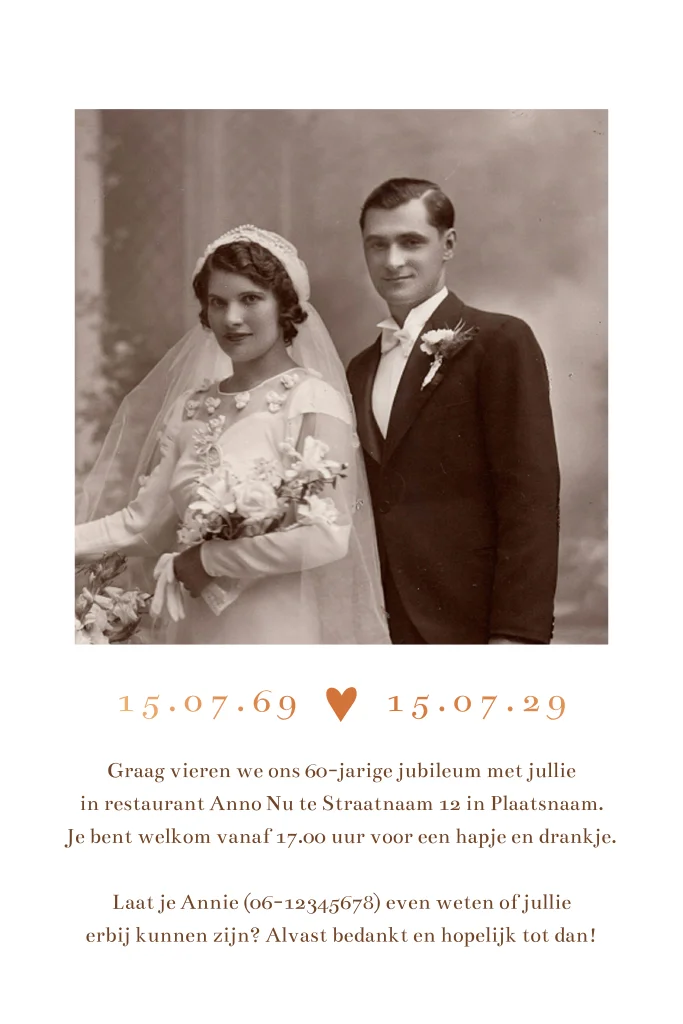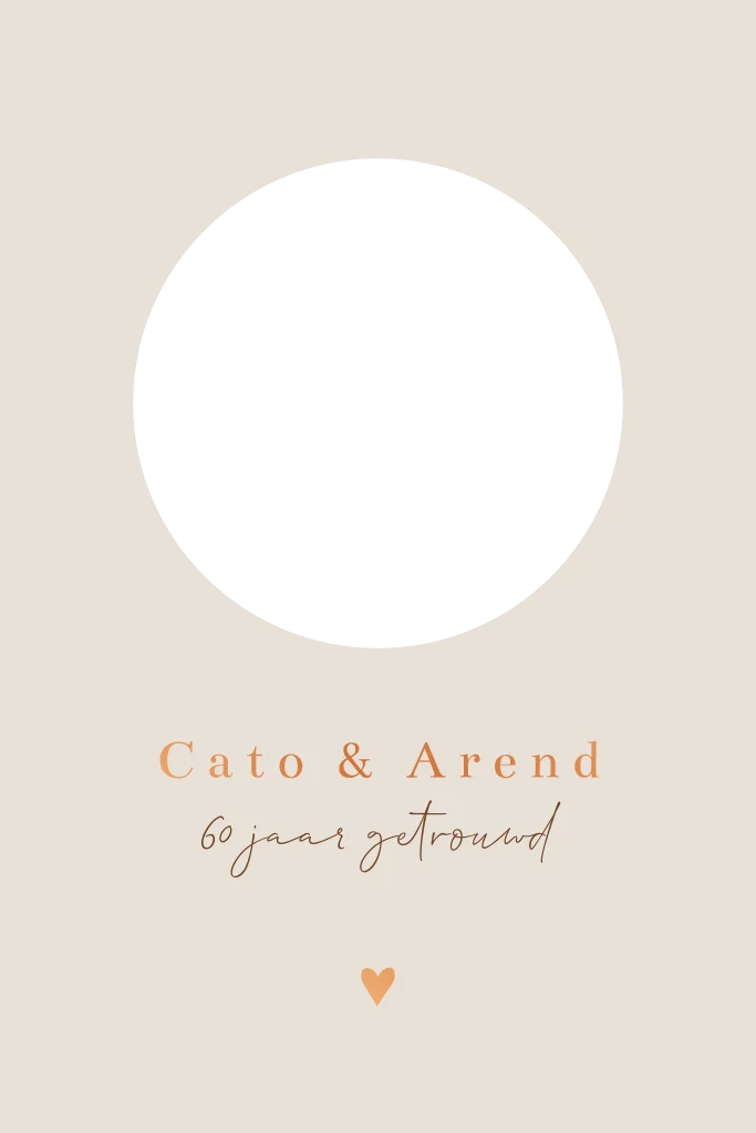 Elegantie ontmoet eenvoud in deze beige uitnodiging voor een jubileum van 60 jaar met ronde uitsnede. Het subtiele doorkijkje onthult een mooie foto van jullie samen (van vroeger of van nu!). Een prachtige jubileumkaart met een persoonlijk tintje. Pas deze kaart zelf naar eigen wens aan in onze ontwerptool.