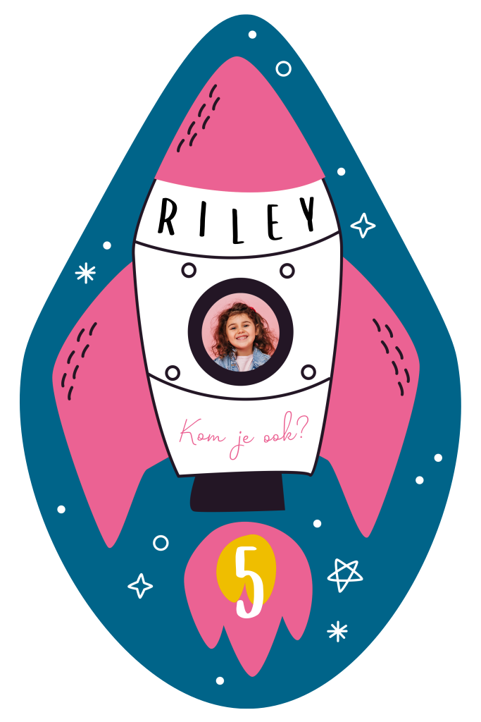 Viert jouw dochter binnenkort een feestje met een space thema? Nodig alle vriendjes en vriendinnetjes dan uit met deze originele kaart in de vorm van een raket! De kaart heeft een bijzondere vorm en is daarom extra leuk. In het raampje van de raket kun je een foto van de jarige jet plaatsen. Op de achterkant is ruimte voor alle informatie over het partijtje.