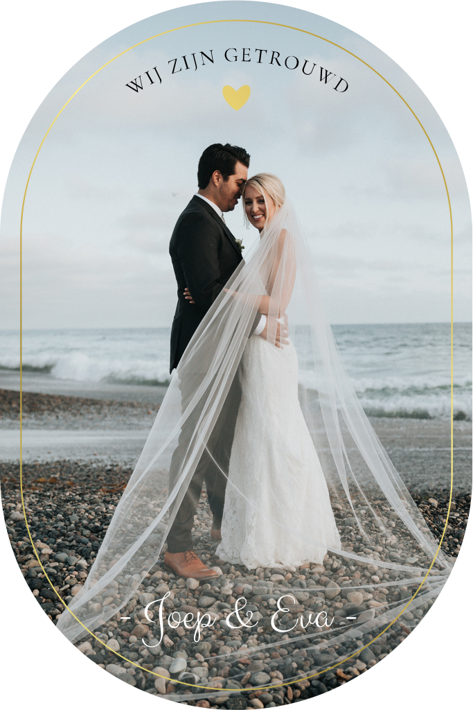 Ovale wij zijn getrouwd kaart met foto en goudfolie