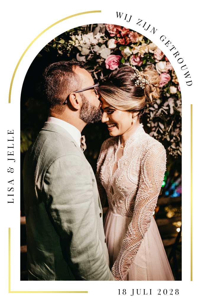 Ben je op zoek naar een bijzondere 'Wij zijn getrouwd' kaart? Deze kaart heeft niet alleen een bijzondere vorm maar ook nog een mooi kader in goudfolie. Plaats een prachtige foto van jullie trouwdag in het midden en de kaart is al bijna af.