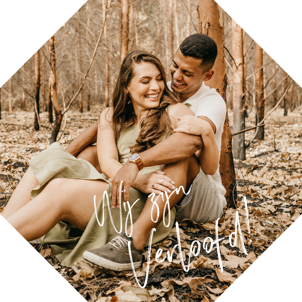 Ben je op zoek bent naar een originele verlovingskaart? Deze achthoekige kaart is opvallend door zijn bijzondere vorm! Je hebt verder niet veel nodig om de kaart mooi te maken. Plaats een mooie foto van jullie samen en in een speels lettertype de tekst erop en klaar!
