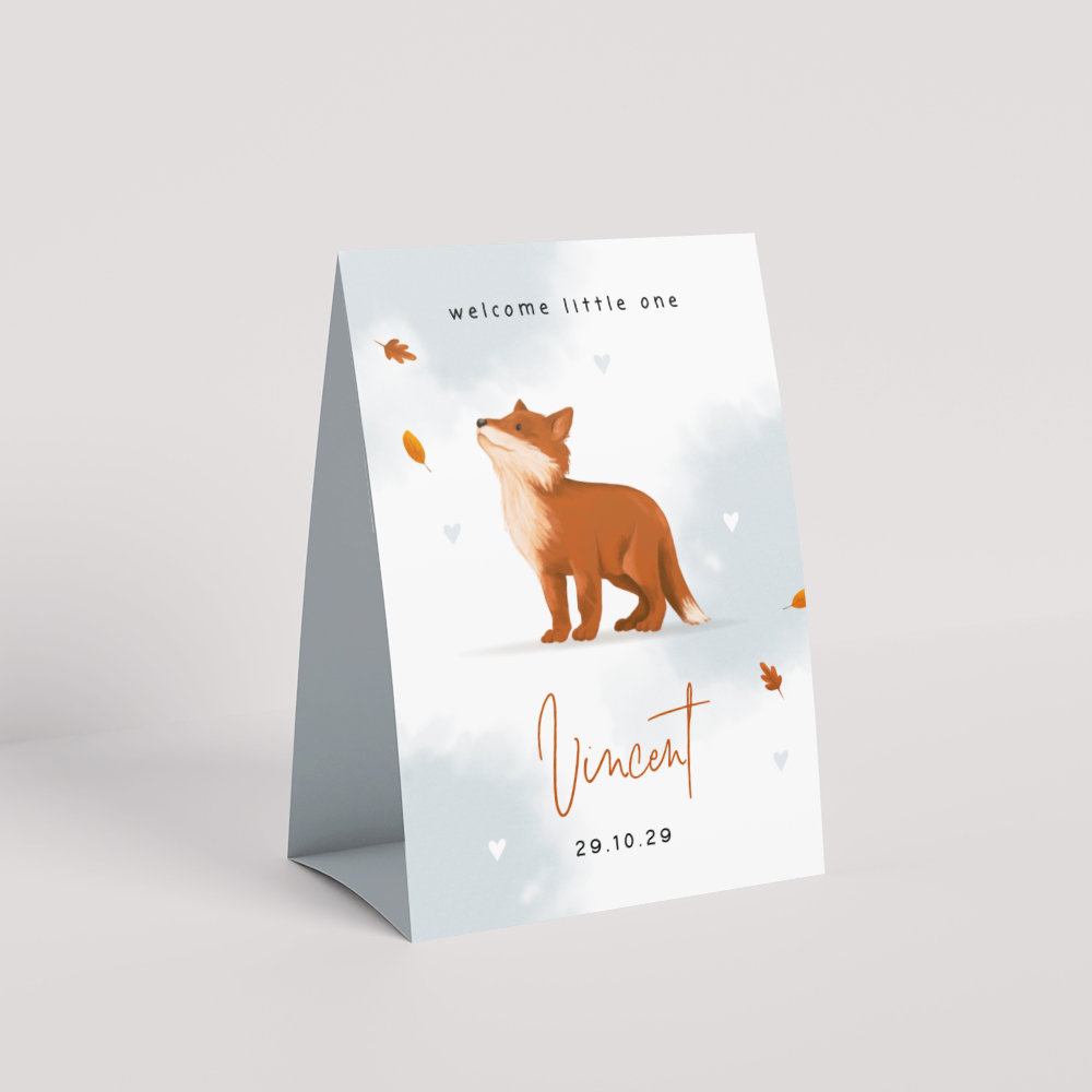 Verwelkom de nieuwste toevoeging aan je familie met dit betoverende geboortekaartje in unieke tentvorm! Met een schattig waterverf vosje en zachte blauwe tinten is dit een lieflijk en dromerig geboortekaartje. De subtiele herfstblaadjes voegen een vleugje magie toe aan de aankondiging van je kleine jongen. Een uniek en speels ontwerp dat de pracht van de natuur en jullie gelukkige momenten samenbrengt. Laat dit tentkaartje het begin zijn van vele mooie herinneringen!