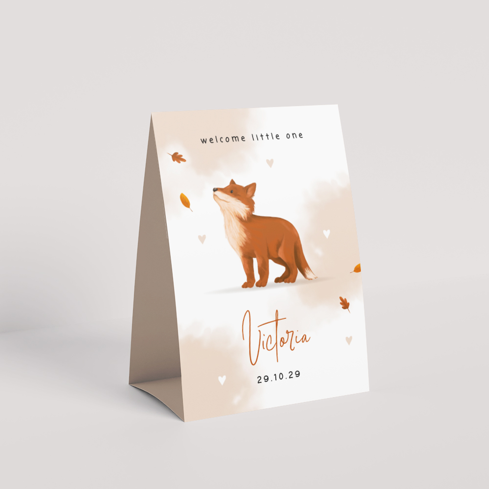 Verwelkom de nieuwste toevoeging aan je familie met dit betoverende geboortekaartje in unieke tentvorm! Met een schattig waterverf vosje en zachte beige/roze tinten, straalt dit kaartje warmte en liefde uit. De subtiele herfstblaadjes voegen een vleugje magie toe aan de aankondiging van je kleine meisje. Een uniek en speels ontwerp dat de pracht van de natuur en jullie gelukkige momenten samenbrengt. Laat dit tentkaartje het begin zijn van vele mooie herinneringen!