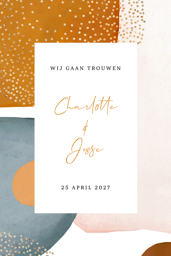 Ben je op zoek naar een artistieke trouwkaart om jullie huwelijk aan te kondigen? Deze abstracte trouwkaart met aquarel vlekken in roestbruin, roze en blauw zal zeker in de smaak vallen. voorop staat in een wit kader de aankondiging van jullie huwelijk. Achterop kun je alle overige tekst kwijt. bestel een drukproef om de kaart eerst in het echt te zien en vast te houden.