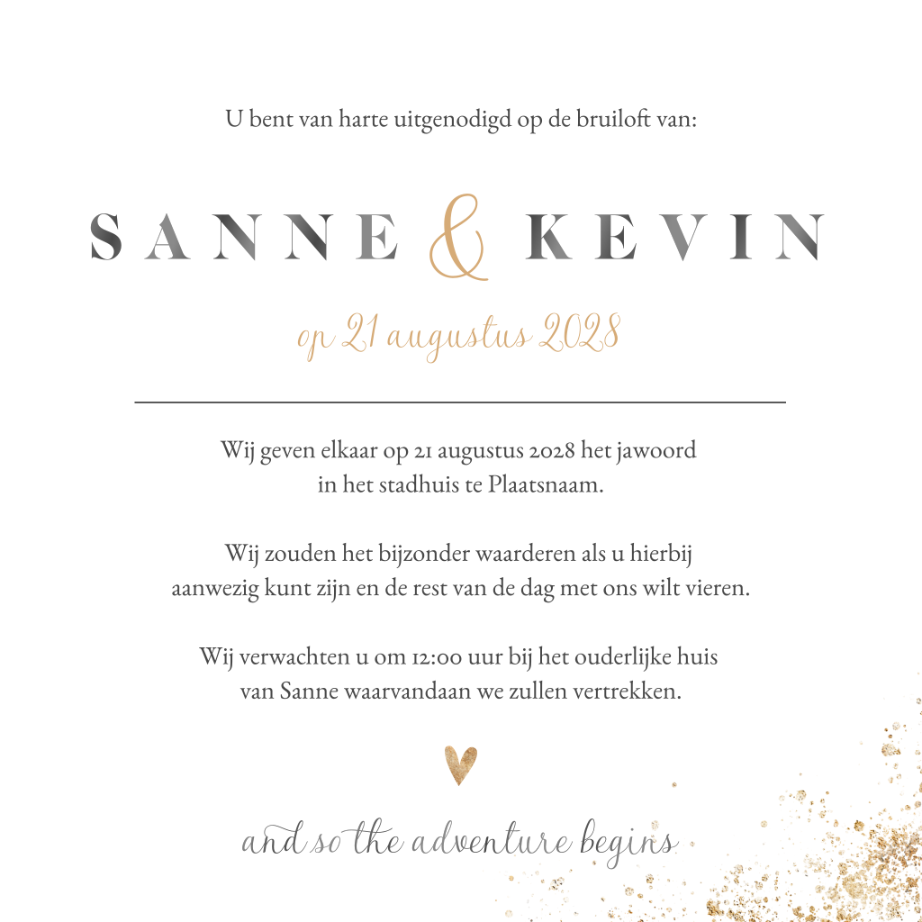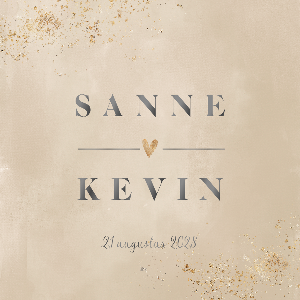 Trouwkaart met beige waterverf en goudkleurige spetters. Beige waterverf met goudkleurige spetters zijn letterlijk een gouden combinatie en staat geweldig op deze vierkante trouwkaart. Je kunt het ontwerp in de editor geheel naar wens aanpassen. Tevreden met je ontwerp? Bestel een drukproef.