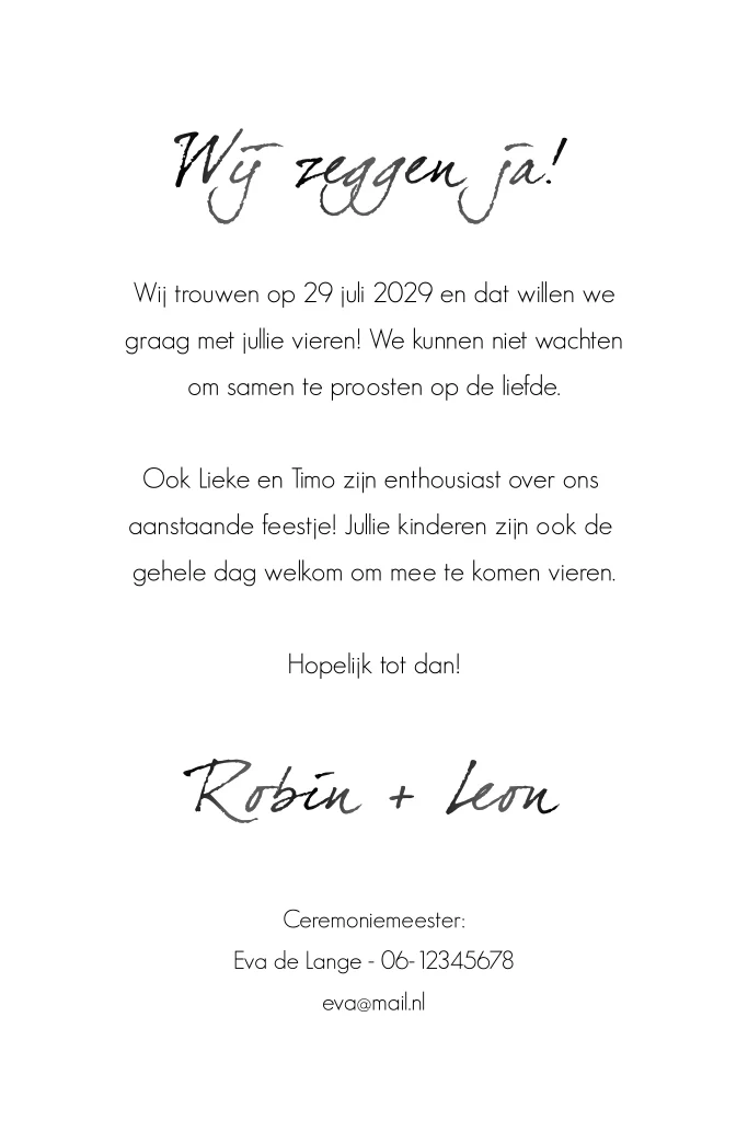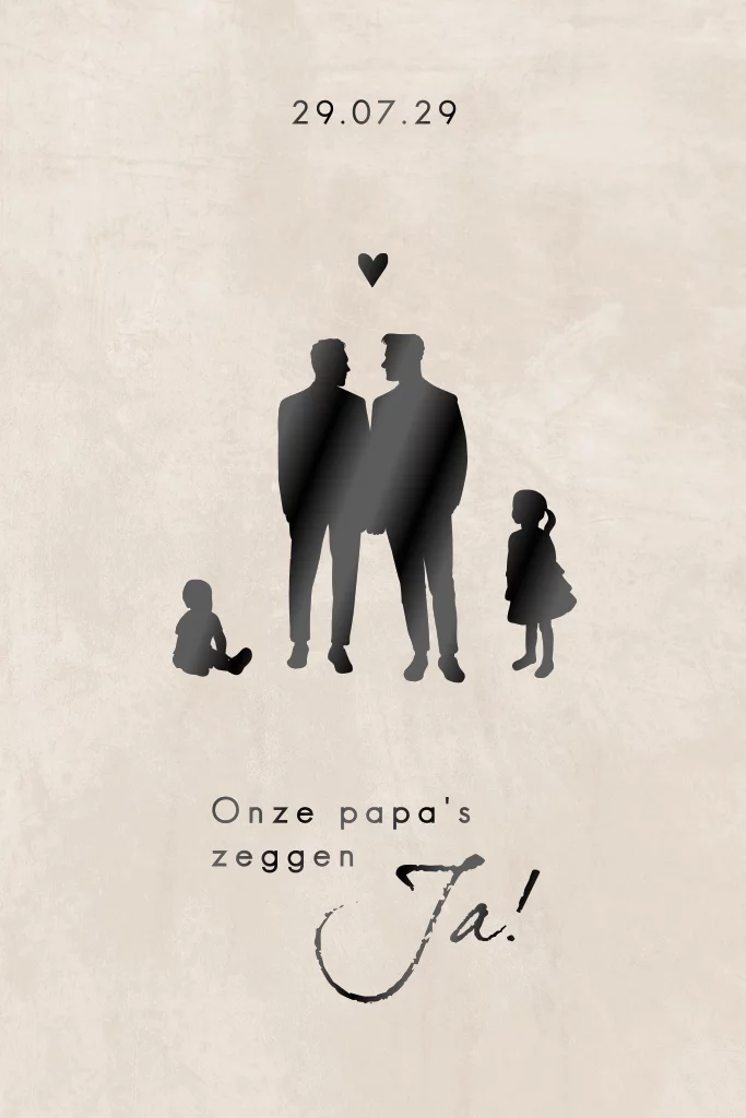 Stijlvolle, beige trouwkaart met silhouetjes in hoogglans zwart van een gezinnetje met twee kinderen en twee vaders. Pas de kaart aan naar eigen wens met behulp van onze handige editor. Kies bijvoorbeeld andere silhouetjes in de map 'Silhouet familie' om deze kaart te personaliseren. Aan de binnenzijde is ruimte voor alle info over jullie grote dag.