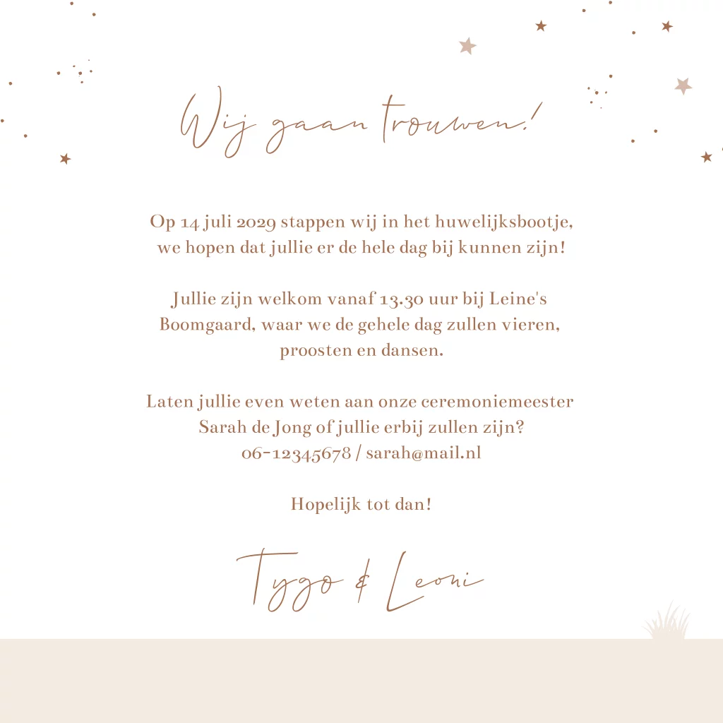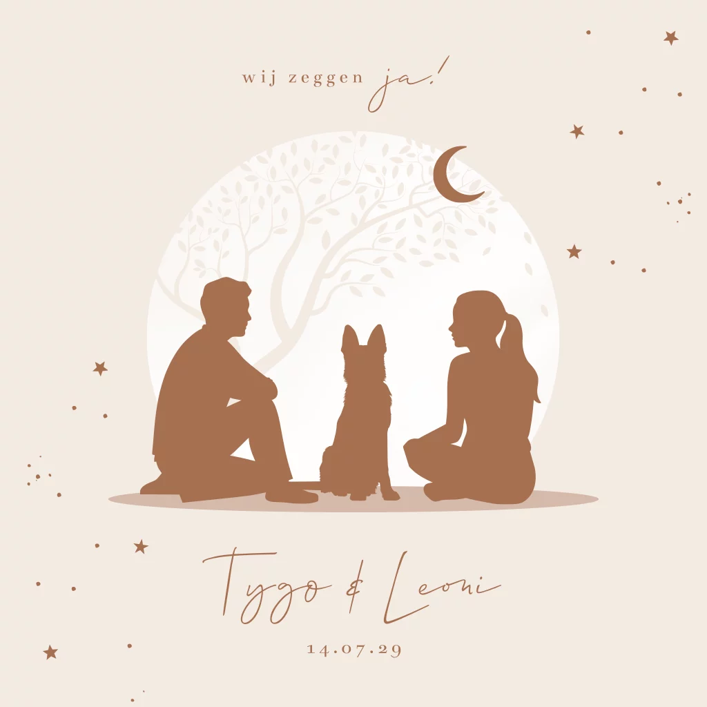 Op zoek naar een unieke trouwkaart waarop jullie trouwe viervoeter een plekje krijgt? Ga voor dit beige en bruine silhouet trouwkaartje met hond en stelletje. Pas het silhouetje van de hond aan, in de map 'Silhouet honden' vind je allerlei andere hondenrassen. Een kat toevoegen kan natuurlijk ook! Daarnaast kun je deze uitnodiging verder personaliseren door kleuren of lettertypes te wijzigen in onze handige editor.