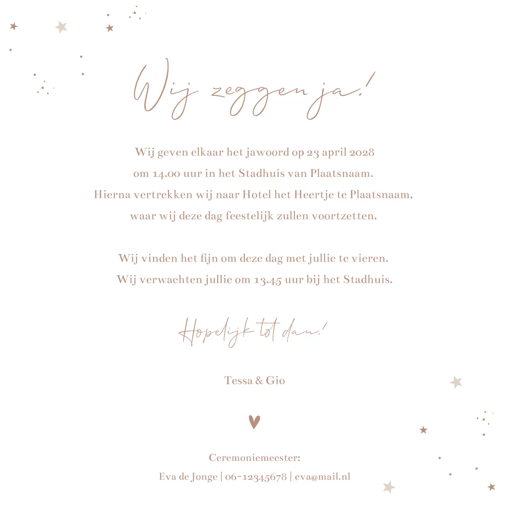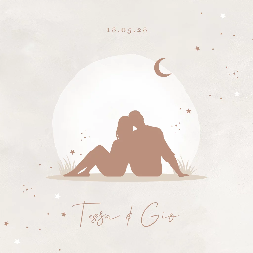 Een eigentijds trouwkaart in beige tinten met een silhouet stelletje dat samen naar de zonsondergang kijkt. De maan en sterren staan al aan de hemel. In sierlijke letters komen jullie namen onderaan. Aan de binnenzijde komt het silhouetje stelletje terug en kun je alle informatie over jullie grote dag plaatsen. Liever andere lettertypes? Pas dit trouwkaartje eenvoudig aan in onze editor.