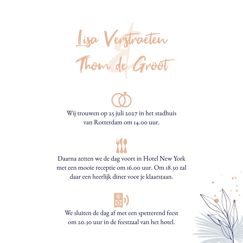 Blauwe trouwkaart met bladeren en rosékleurige typografie. Op zoek naar een tropische en stijlvolle trouwkaart? Dit donkerblauwe ontwerp heeft een chique uitstraling door de mysterieuze blauwe achtergrond omringd met bladeren. Met roségouden letters staat er groot 'yes' in het midden van de kaart. Daaronder is ruimte voor jullie namen. In de kaart is ruimte voor het dagprogramma en een persoonlijke tekst. De rosékleurige spetters zorgen voor een speels effect. Kijk bij ook verkrijgbaar voor vergelijkbare ontwerpen.