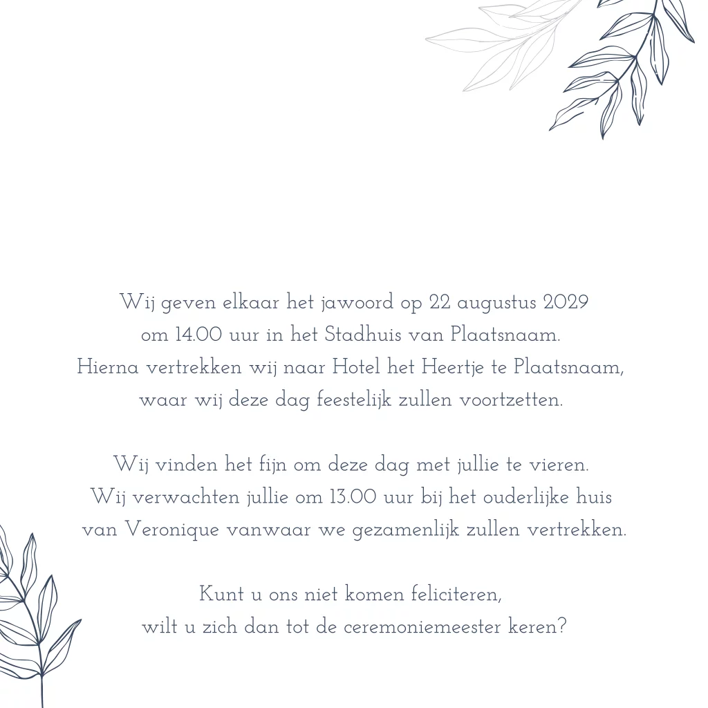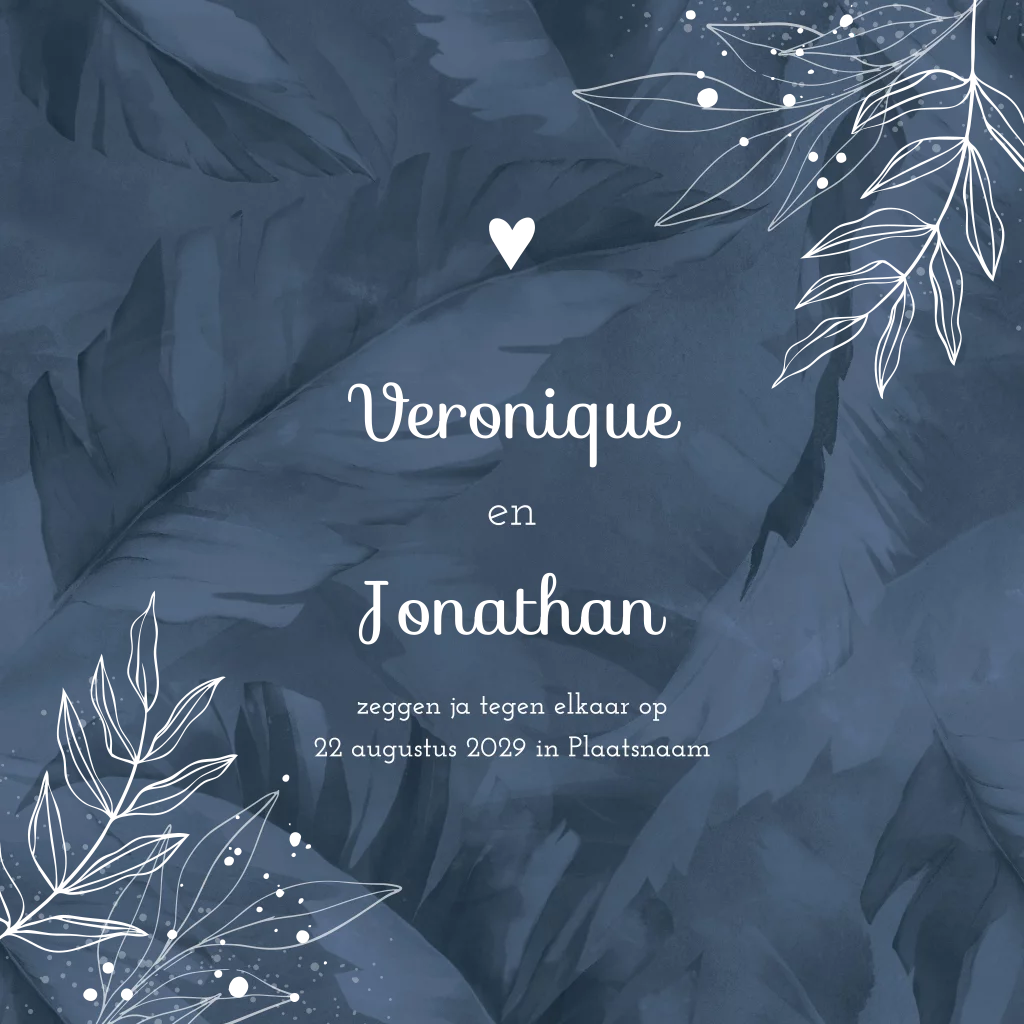 Prachtige botanische trouwkaart met donkerblauwe achtergrond, getekende bladeren en roségoudfolie details. Jullie namen komen in glimmend roségoud voorop. De kaart wordt versierd met blaadjes, hartjes en spetters. In de kaart is voldoende ruimte voor het dagprogramma en een persoonlijke boodschap. Pas het ontwerp naar wens aan in de ontwerptool. Tip van ons, ook met zilver- of goudfolie is deze kaart heel erg mooi.