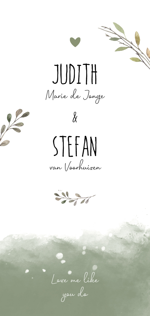 Dromerige botanische trouwkaart met groene takjes en bladeren. Op zoek naar een botanische trouwkaart? Misschien is dit dan de kaart voor jullie. Dit dromerige ontwerp is versierd met verschillende takjes en bladeren. Op de achtergrond zie je grijsgroene waterverf. Sierlijke en speelse typografie wisselen elkaar af. Op de achterzijde kun je een persoonlijke tekst voor de genodigden plaatsen.